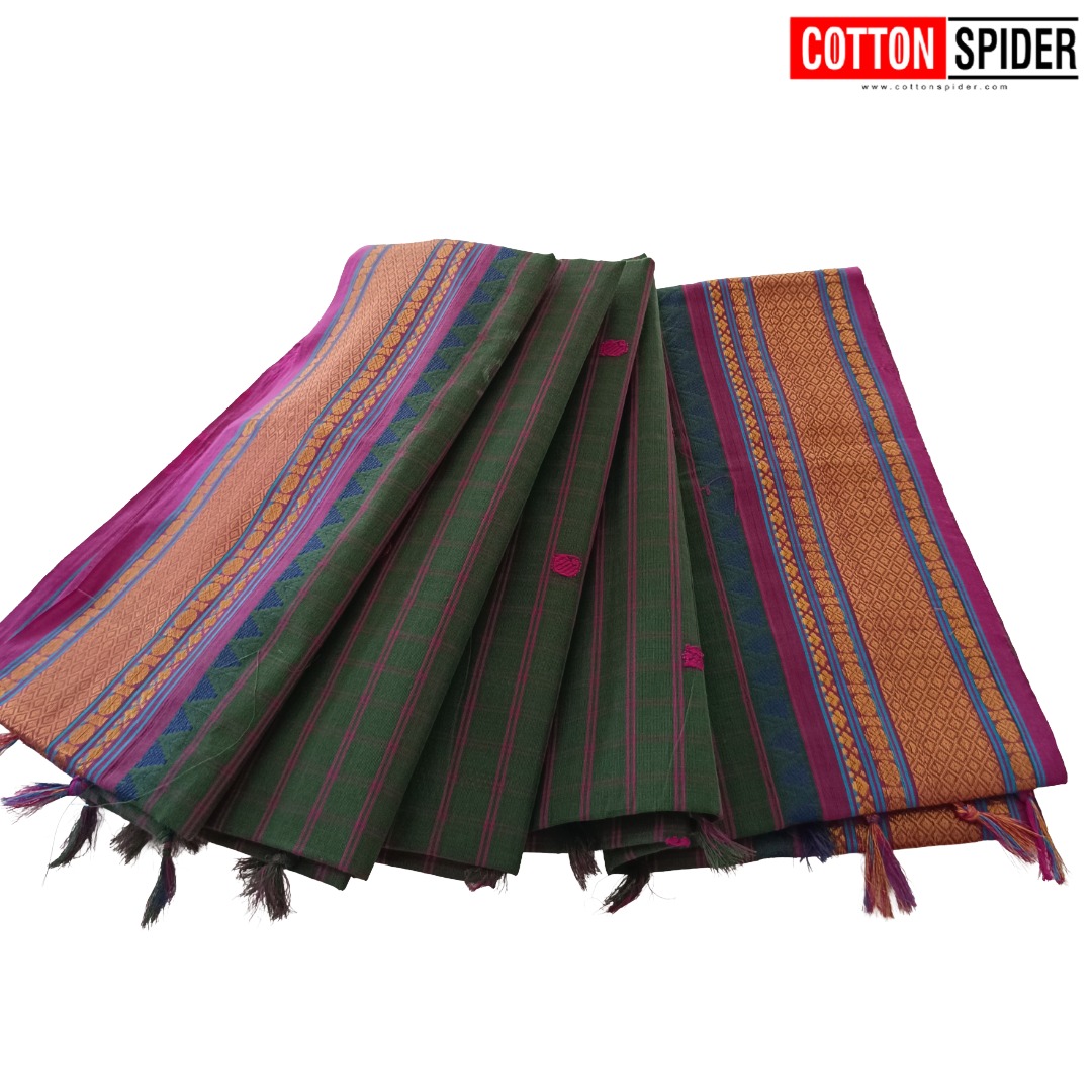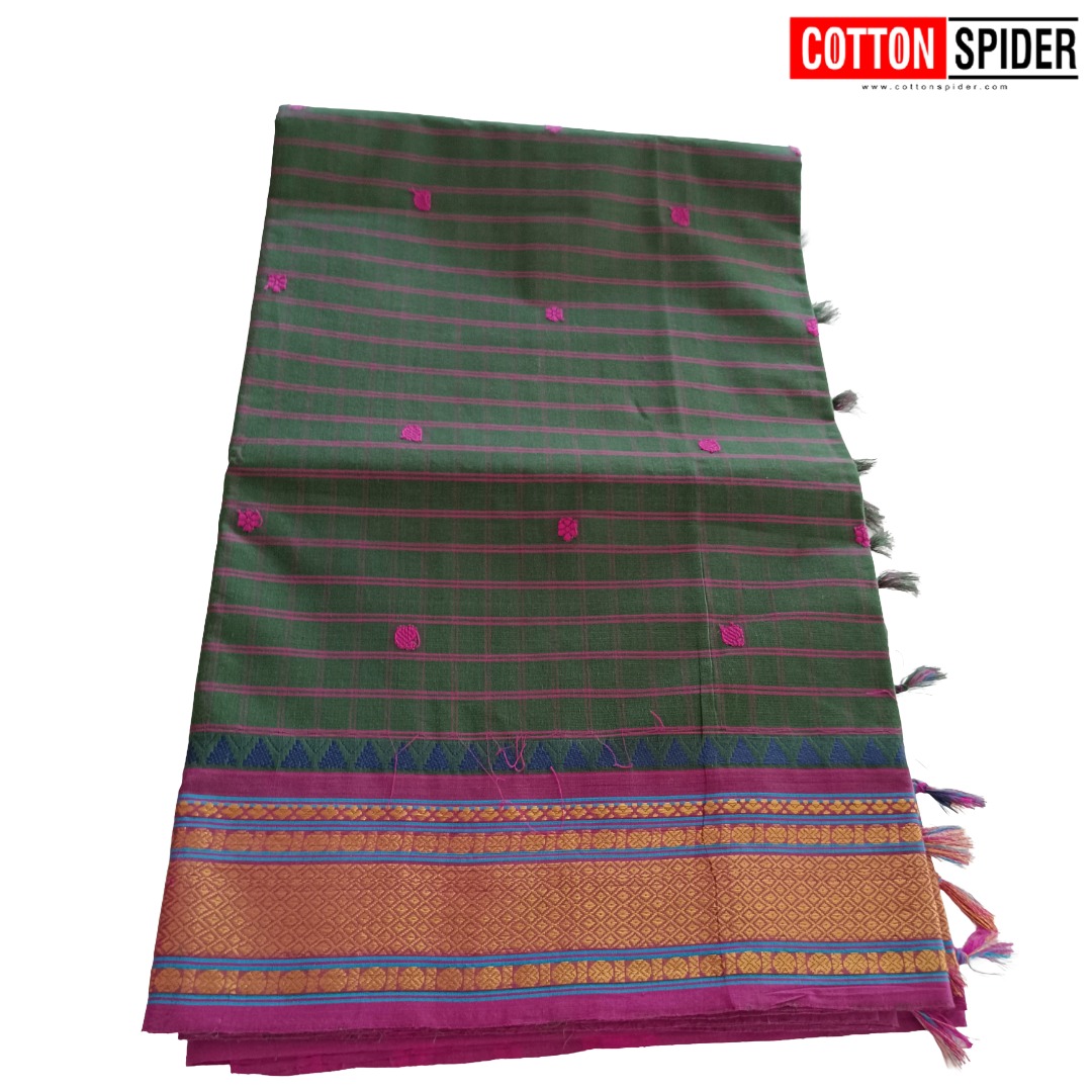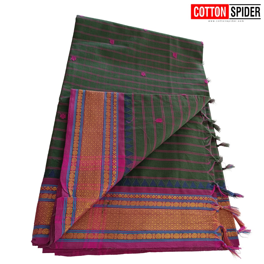 Hailing from the Chettinad region of Tamil Nadu, Chettinadu sarees are known for their bold patterns, striking colors, and durable fabric. These sarees often feature checks, stripes, or temple borders and are traditionally woven in cotton, making them ideal for daily wear. The designs are minimalist yet elegant, reflecting the rich cultural heritage of the Chettinad community. Modern versions also incorporate silk and zari for a more festive look. Renowned for their comfort and ease of draping, Chettinadu sarees are a timeless choice for those who appreciate traditional handloom styles with a contemporary twist.